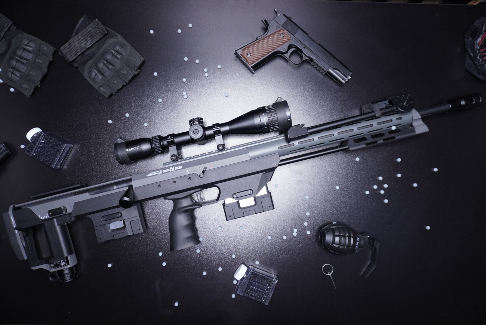 - через бункерный магазин — большая емкость с подачей шариков, позволяющая реже перезаряжать оружие.